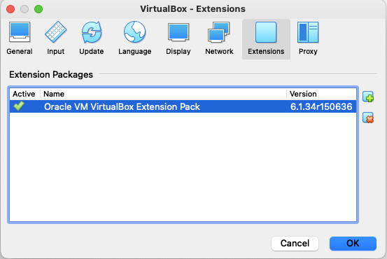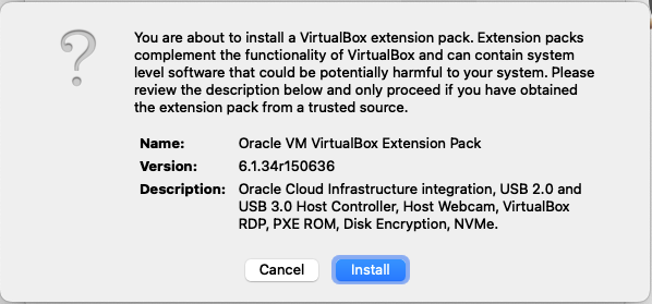 Choose the .vbox-extpack file downloaded in the previous step. Follow the prompts: