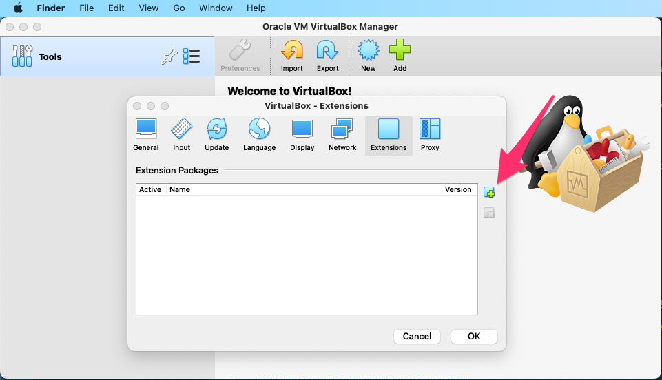 Open VirtualBox, click the "VirtualBox" menu, then Preferences. From there, click on Extensions. Then, click the "Add" button: