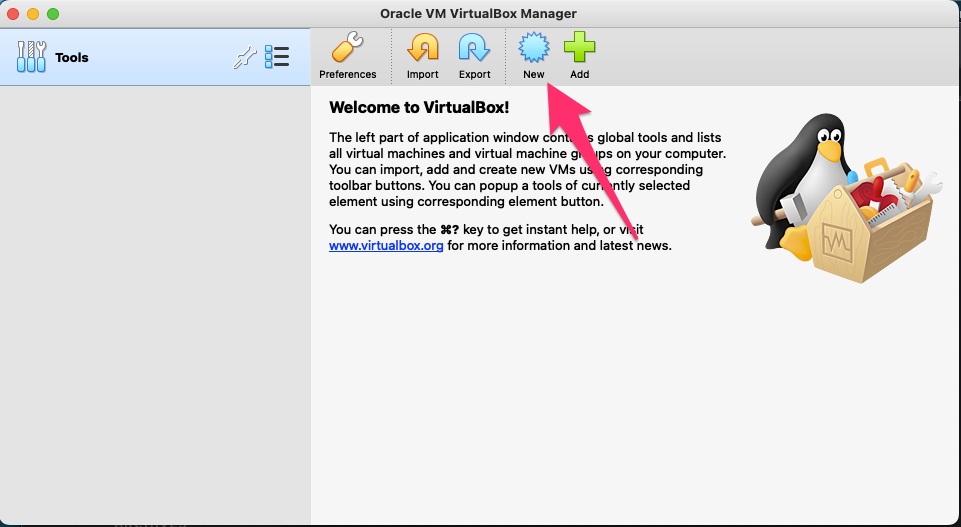 If so, then we are ready to go. Start by launching VirtualBox. Next, click "New":
