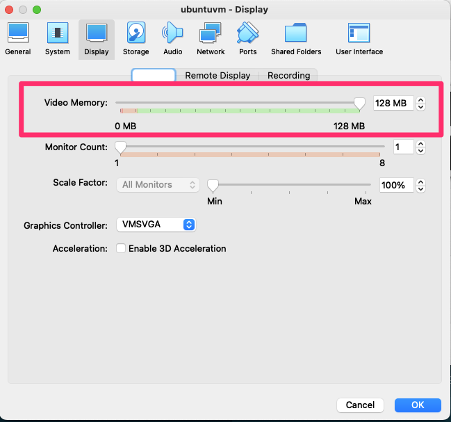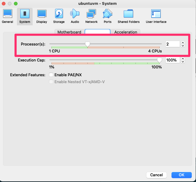 By default, your new VM will just get 1 CPU core. In modern computers, you typically more. VirtualBox, to not overwhelm the host of the VM, only allows you to allocate up to HALF of the number of total cores. This example is running on a Mac Mini with 4 cores. So, I can only up this to two - but it does make a difference!
