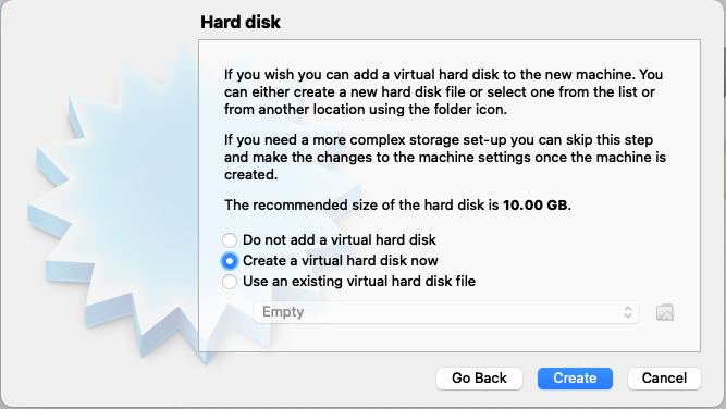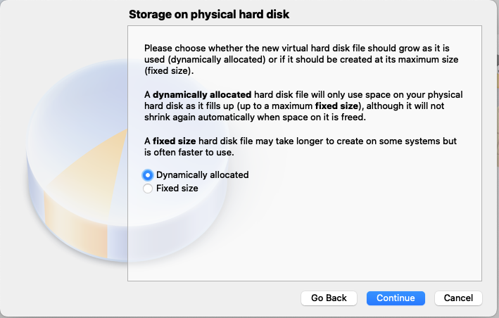A "Fixed size" disk allocates the entire disk on your hard drive, right now. If you configured a 200GB disk for your virtual machine, a Fixed disk will allocate 200GB on your computer right now. However, if you are short on disk space, but want to give the VM the impression that it has more, you can set this to "Dynamically allocated". This means that VirtualBox will only use as much physical disk space as the virtual machine is taking up.