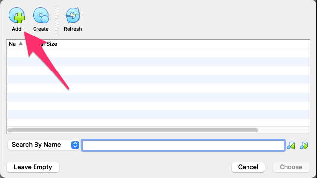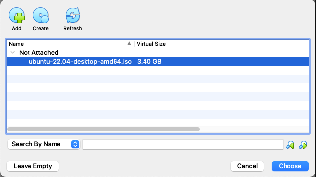 Next, click the Add button to add media to the "media library" that VirtualBox uses. You should navigate to your Downloads folder and point to that ubuntu-22.04-desktop-amd64.iso file you downloaded.