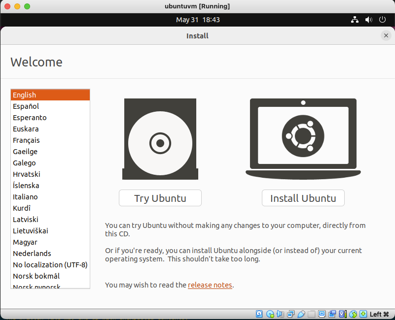 At that point, you should be at the main screen of the Ubuntu installer. You can play around and see if Ubuntu is working correctly - but no files will be saved - OR you can install it on this virtual machine.