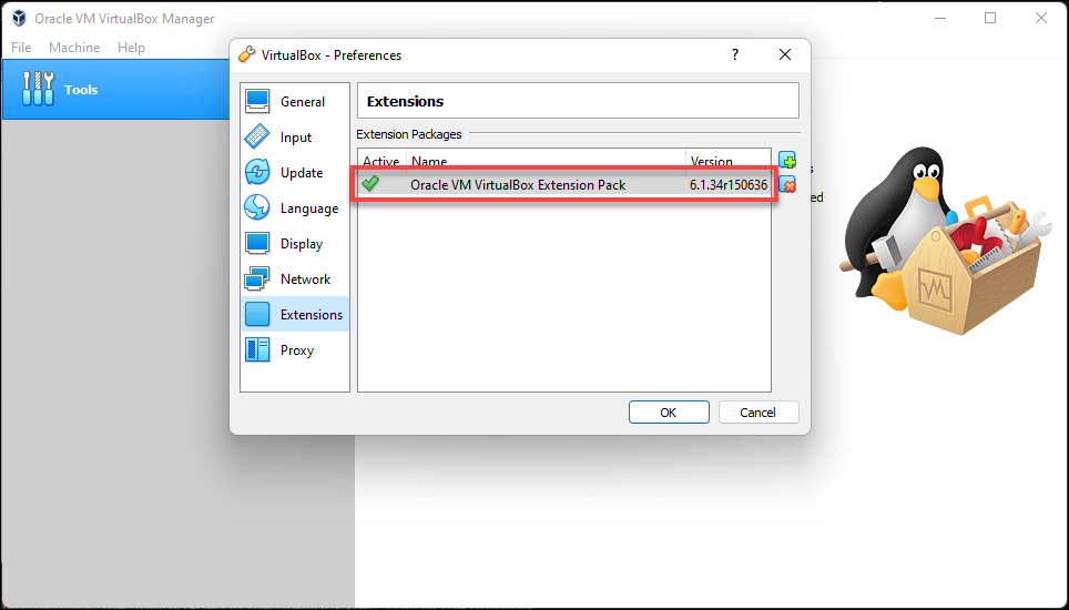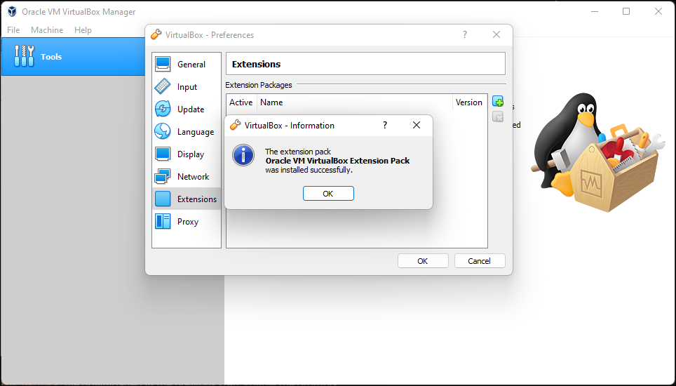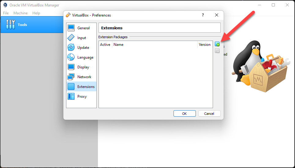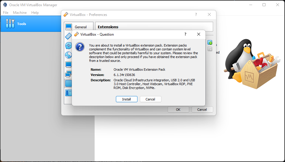 Choose the .vbox-extpack file downloaded in the previous step. Follow the prompts: