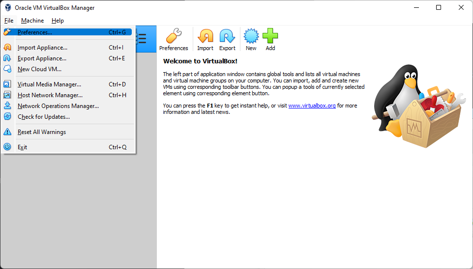 From the main VirtualBox window, click on the File, and the Preferences menu: