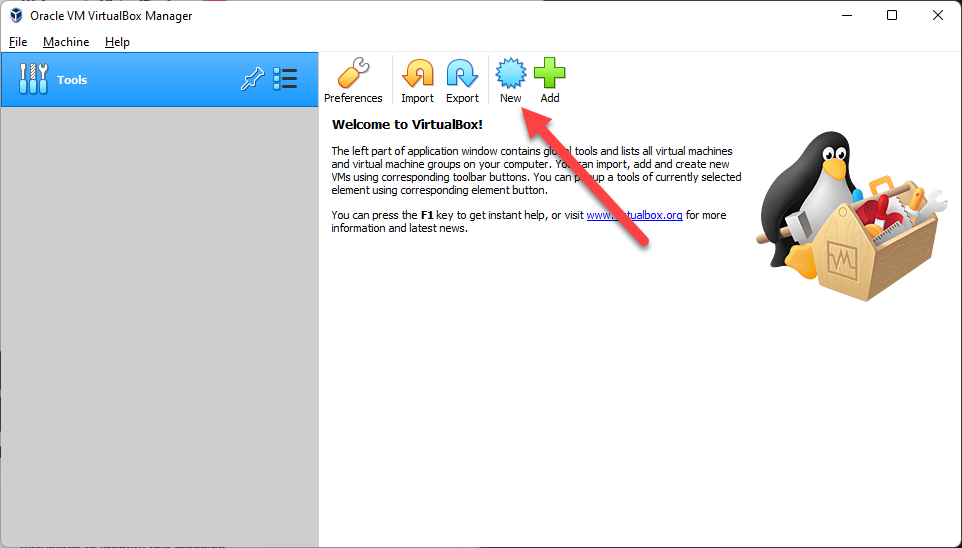 If so, then we are ready to go. Start by launching VirtualBox. Next, click "New":
