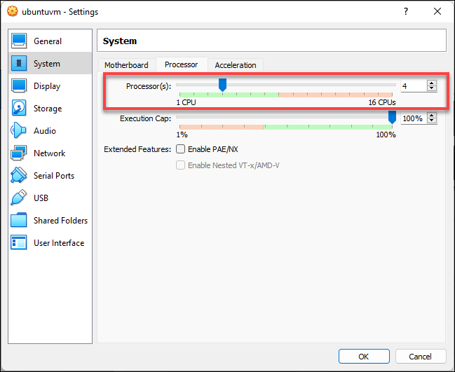 By default, your new VM will just get 1 CPU core. In modern computers, you typically more. VirtualBox, to not overwhelm the host of the VM, only allows you to allocate up to HALF of the number of total cores. This example is running on a Mac Mini with 4 cores. So, I can only up this to two - but it does make a difference!