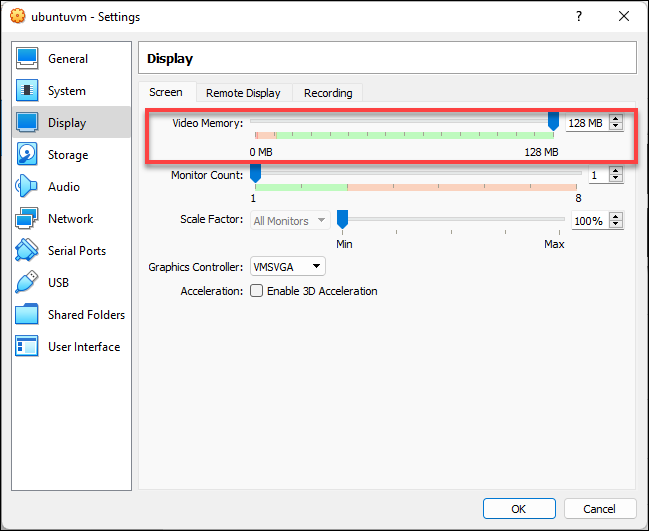 Next, by default, you get the minimal amount of video RAM which can cause you to run into problems with certain OS'es. So, up this to the maxmimum amount.