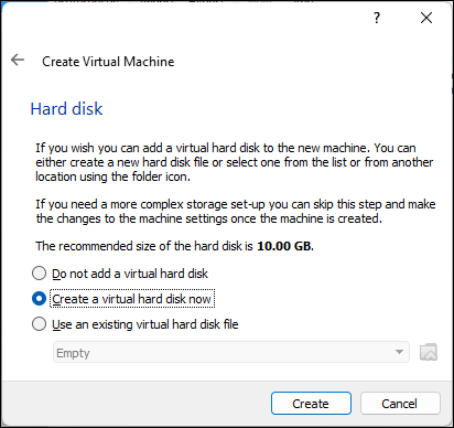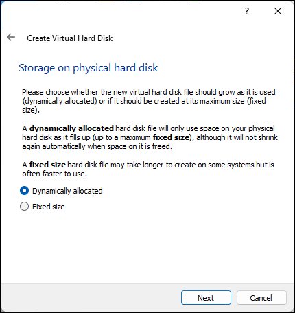 A "Fixed size" disk allocates the entire disk on your hard drive, right now. If you configured a 200GB disk for your virtual machine, a Fixed disk will allocate 200GB on your computer right now. However, if you are short on disk space, but want to give the VM the impression that it has more, you can set this to "Dynamically allocated". This means that VirtualBox will only use as much physical disk space as the virtual machine is taking up.
