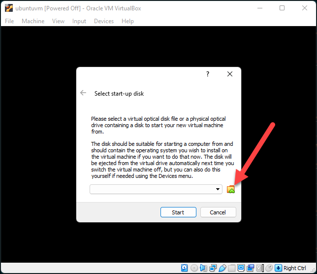 Upon first launch, VirtualBox assumes you want to install an operating system. So, this first screen is prompting you to (virtually) insert some media into the (virtual) DVD reader. Click on the little button to browse for files.