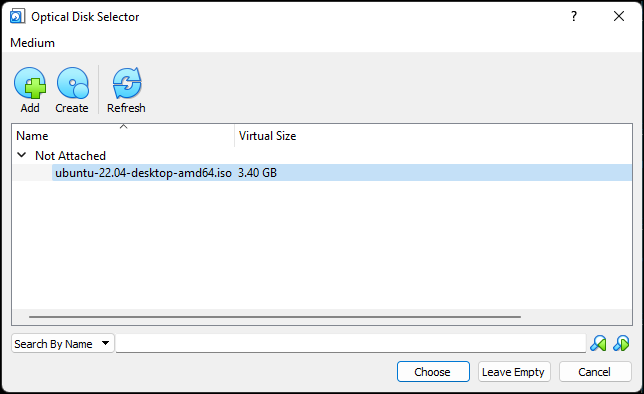 Next, click the Add button to add media to the "media library" that VirtualBox uses. You should navigate to your Downloads folder and point to that ubuntu-22.04-desktop-amd64.iso file you downloaded. Once added, click "Choose" to use that as your boot media.