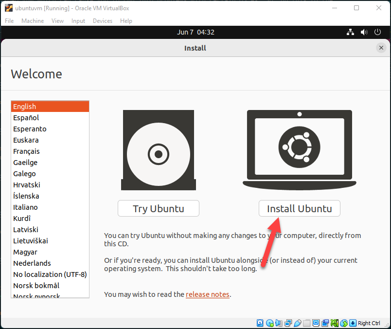 At that point, you should be at the main screen of the Ubuntu installer. You can play around and see if Ubuntu is working correctly - but no files will be saved - OR you can install it on this virtual machine.