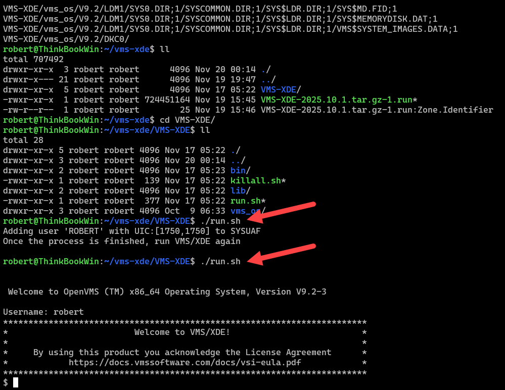 In modern day, OpenVMS is owned and supported by VMS Software Inc. (VSI), which continues to develop and maintain the operating system. VSI has made OpenVMS available on x86-64 hardware, which means it can run on modern servers and virtualization platforms. Their latest offering is this VMS-XDE release, which runs sort of like a subsystem on top of Linux. You launch it by running a command from the Bash terminal.