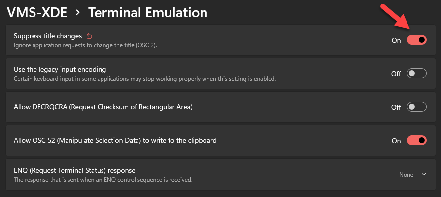 One other small thing that helps is under "Terminal Emulation" in that Windows Terminal profile, enable the option to "Suppress title changes". This prevents OpenVMS from changing the terminal title to something like "Ubuntu" every time you launch it.